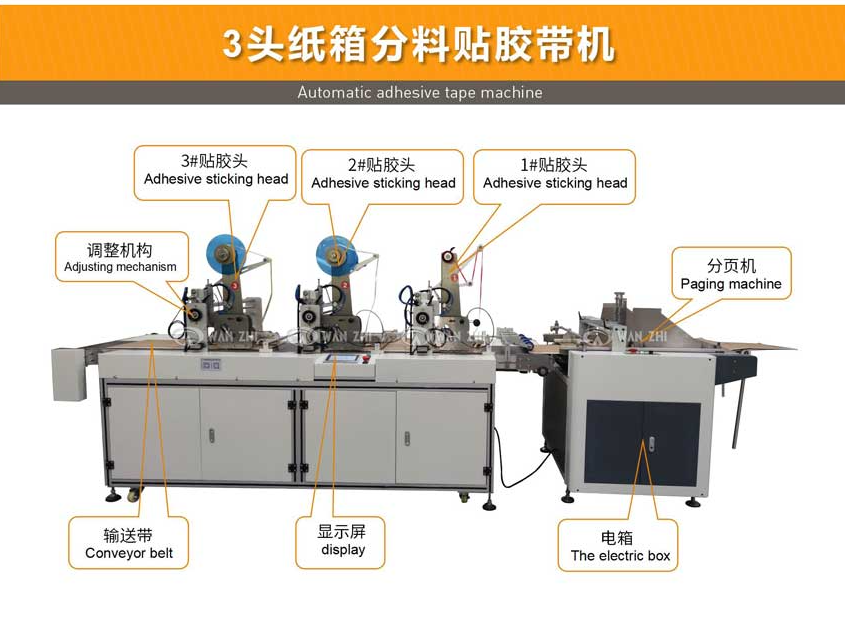本機型可配置2個或3個貼膠頭,實現輸送方向同時貼多條膠帶,貼合長度可任意設定; 貼膠頭可根據用戶需求選配;