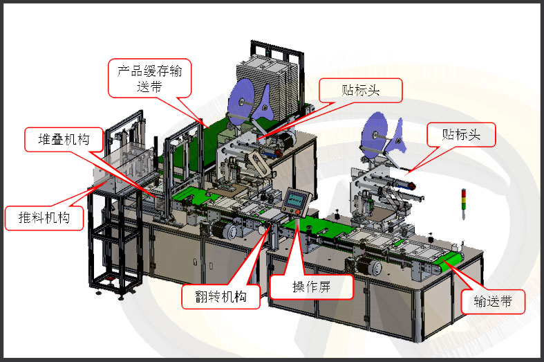 自動啟動——>人工放料 ——>1#標頭攔停產品貼標——>180度自動翻轉產品——>2#標頭攔停產品貼標——>產品堆疊——>推送推疊產品——>人工收料。