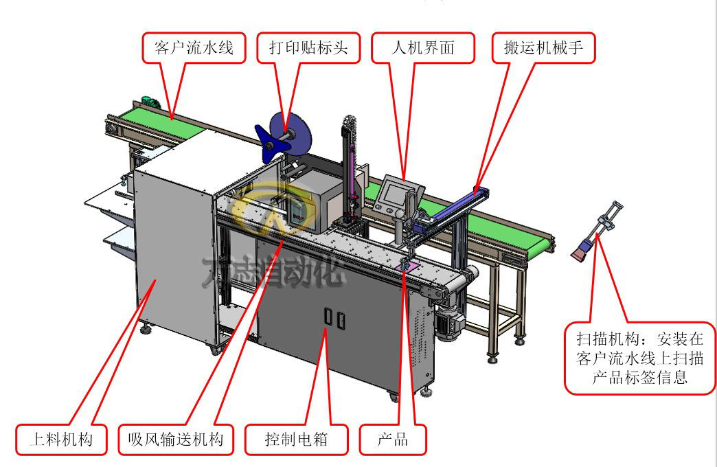 3.掃描槍掃描信息并傳回電腦,打印機打印標簽,吸頭吸取標簽;傳感器檢測到產品到達貼標位,貼標機械手進行貼標