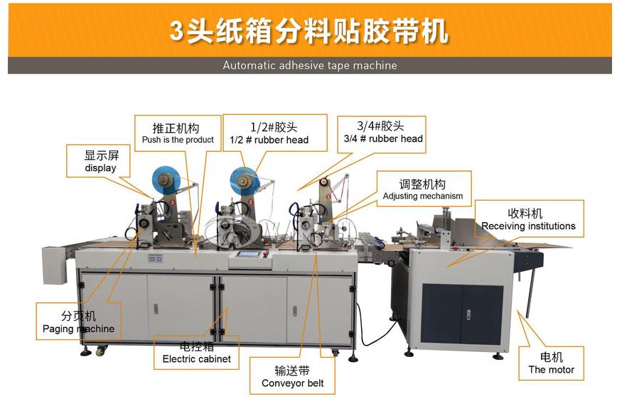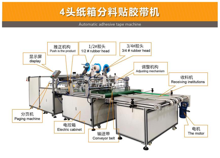 可配置2-4個(gè)貼膠頭,實(shí)現(xiàn)輸送方向同時(shí)貼2條膠帶,貼合長(zhǎng)度可任意設(shè)定;貼膠頭可根據(jù)用戶(hù)需求選配;設(shè)備可選自動(dòng)分料/收料機(jī)構(gòu),工作效率約50-90m/min(效率與產(chǎn)品尺寸有關(guān));